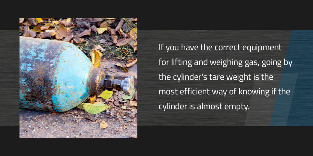 If you have the correct equipment for lifting and weighing gas, going by the cylinder’s tare weight is the most efficient way of knowing if the cylinder is almost empty.