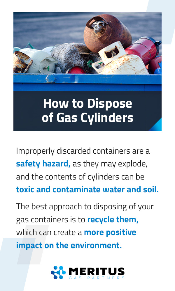 Improperly discarded containers are a safety hazard, as they may explode, and the contents of cylinders can be toxic and contaminate water and soil. The best approach to disposing of your gas containers is to recycle them, which can create a more positive impact on the environment. You can establish a recycling program by contacting your local recycling facility to discuss if they recycle gas cylinders.