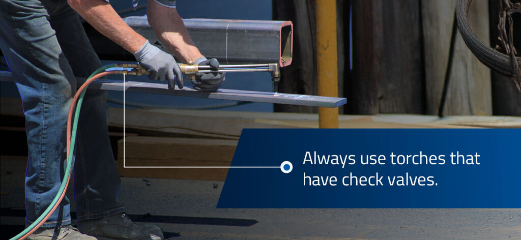 Always purge the system before lighting any torch! Always use torches that have check valves. Flashback arrestors can be used where appropriate. Contact the gas equipment manufacturer for guidelines on when and how to use flashback arrestors.