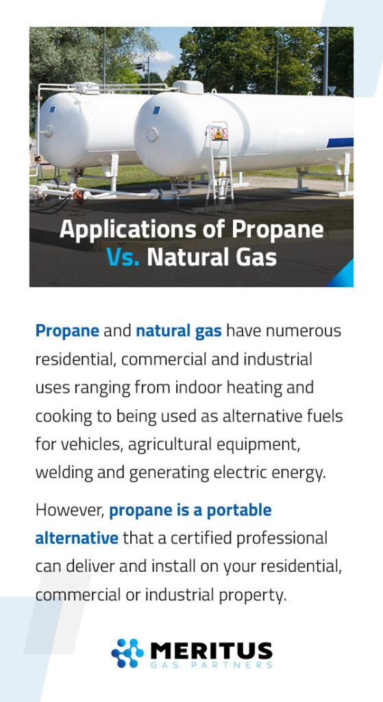 Propane and natural gas have numerous residential, commercial and industrial uses ranging from indoor heating and cooking to being used as alternative fuels for vehicles, agricultural equipment, welding and generating electric energy. The difference in performance in all the applications is negligible, and the choice typically comes down to your location because natural gas utility pipelines are not available everywhere.