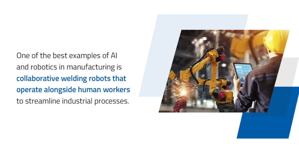 You can automate your systems through robots and by integrating AI-supported software. One of the best examples of AI and robotics in manufacturing is collaborative welding robots that operate alongside human workers to streamline industrial processes.