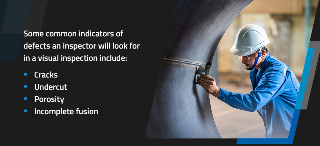 A visual inspection is the first and most straightforward method to test weld quality. A trained inspector examines the surface of the weld with the naked eye or magnifying tools for any visual defects — issues that exceed the visual acceptance criteria. Some common indicators of defects an inspector will look for in a visual inspection include: