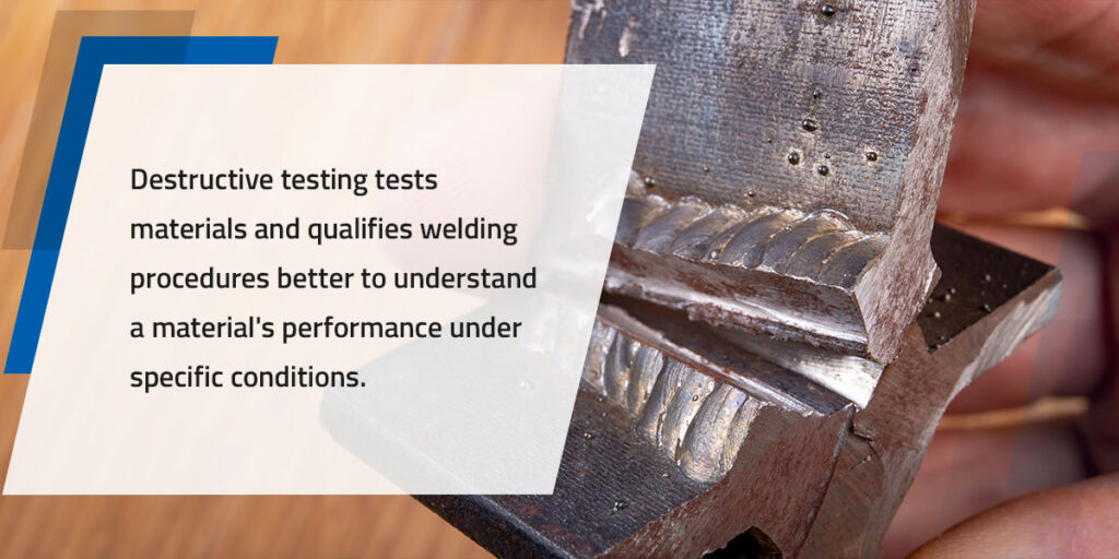 Destructive testing tests materials and qualifies welding procedures better to understand a material’s performance under specific conditions. The process also covers testing welders’ abilities to complete a particular function, also known as a weld test. DT methods are often more accessible than nondestructive testing, providing detailed information and straightforward result interpretation.