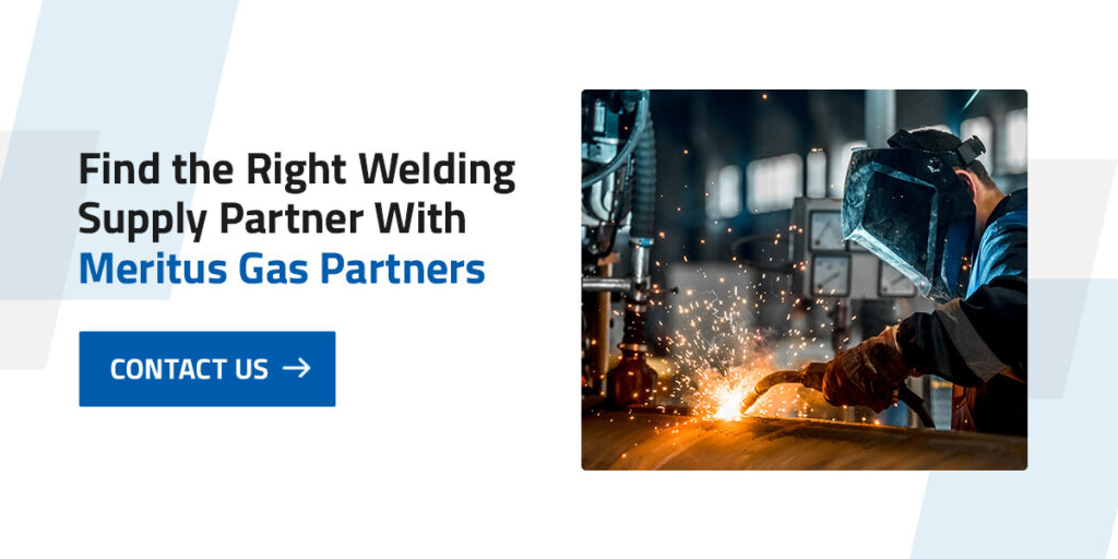 Using premium equipment combined with proper filler materials and quality shielding gas can transform your weld quality and help your products stand up to the most rigorous tests. At Meritus Gas Partners, we pride ourselves on assembling a network of high-quality distributors with knowledgeable sales staff to ensure the best outcomes for any welding operation. You can confidently walk into your local Meritus Gas Partners, knowing you’ll find premium and value offerings for many types of welding equipment.
