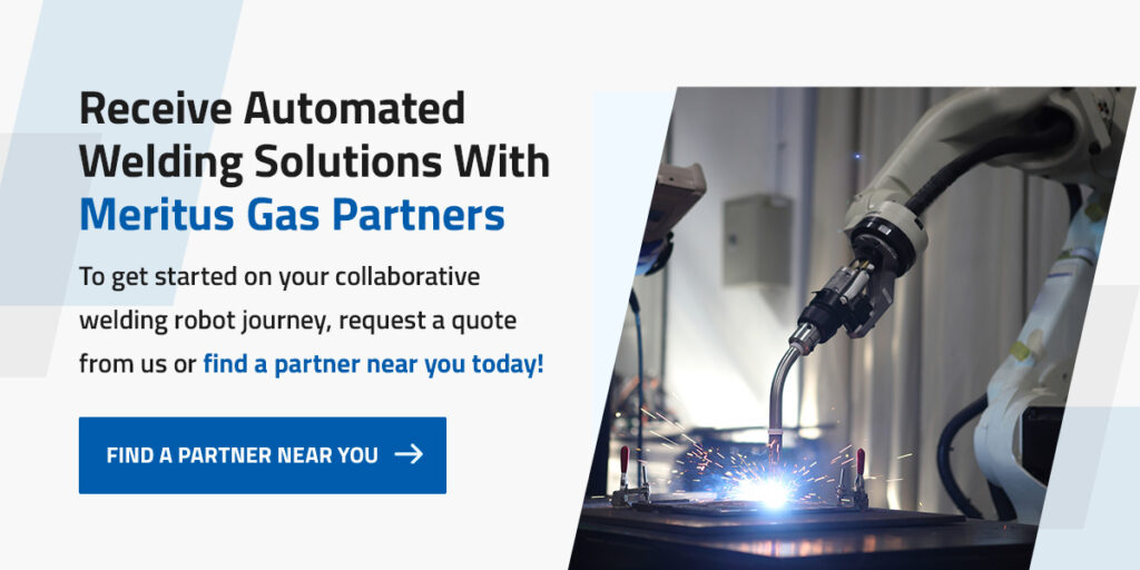 Meritus Gas Partners has suppliers in our network with different cobot solutions to help you choose the best machines and components to match your welding needs. For example, the MOD-WELD Cobot from APT Manufacturing Solutions is a next-generation product with top-of-the-line components. To get started on your collaborative welding robot journey, request a quote from us or find a partner near you today!