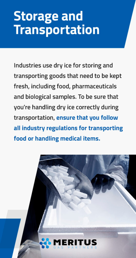 Industries use dry ice for storing and transporting goods that need to be kept fresh, including food, pharmaceuticals and biological samples. By law, dry ice is a hazardous material, and anyone handling it must have the correct training to do so. All shipping companies have specific guidelines for transporting hazardous materials. Additionally, the United States Department of Transportation (DOT) has the following Materials of Trade (MOT) regulations in place: