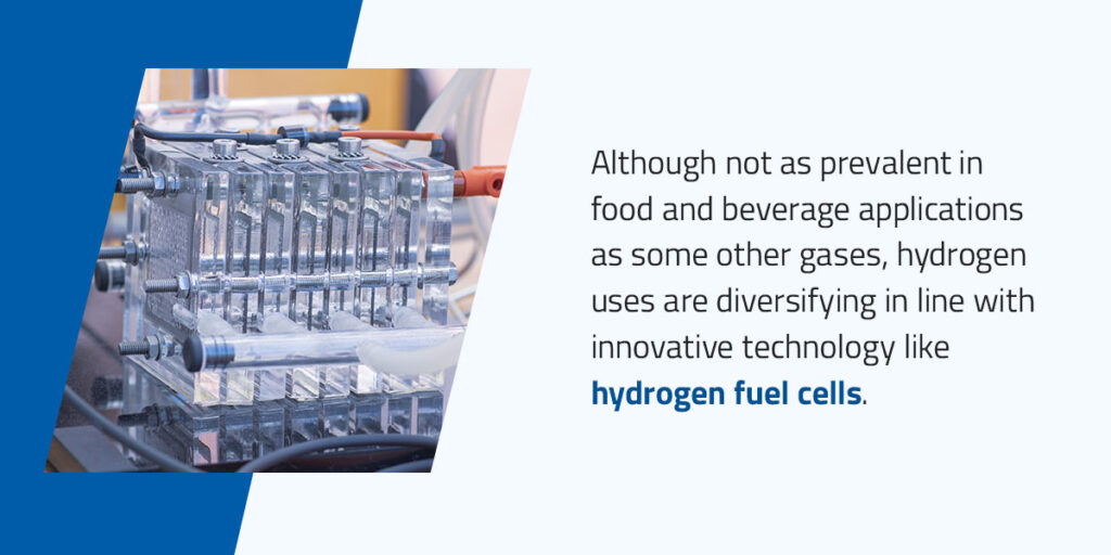 Hydrogen gas (H2) has diverse uses in the food and beverage industry, from food preservation to semi-solid fats. It’s the most abundant element on Earth. Although not as prevalent in food and beverage applications as some other gases, hydrogen uses are diversifying in line with innovative technology like hydrogen fuel cells. Some typical applications for hydrogen include: