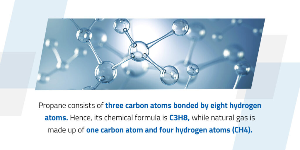 The chemical compositions of propane, natural gas and LPG are very distinct. Propane consists of three carbon atoms bonded by eight hydrogen atoms. Hence, its chemical formula is C3H8, while natural gas is made up of one carbon atom and four hydrogen atoms (CH4).