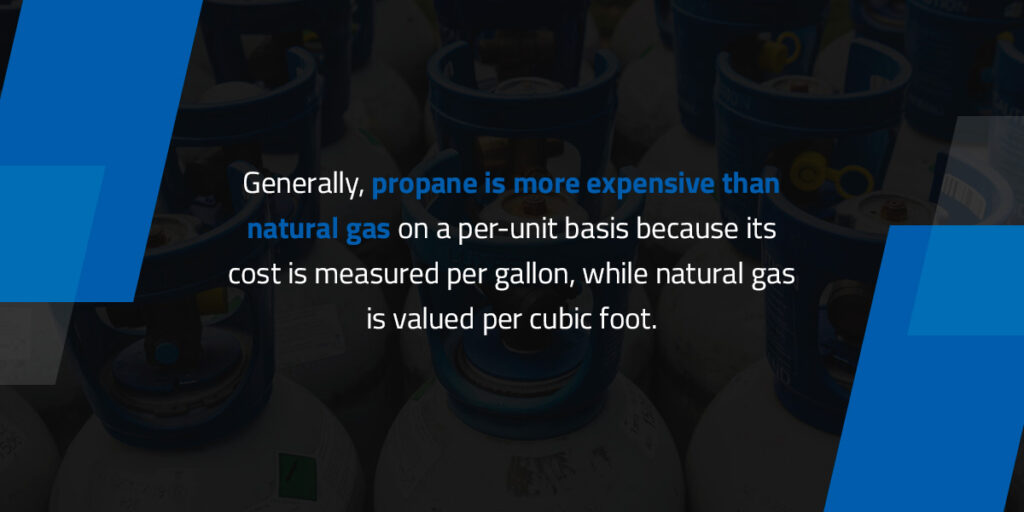 Because these three are fossil fuels, their prices fluctuate over time to meet supply and demand. Generally, propane is more expensive than natural gas on a per-unit basis because its cost is measured per gallon, while natural gas is valued per cubic foot.