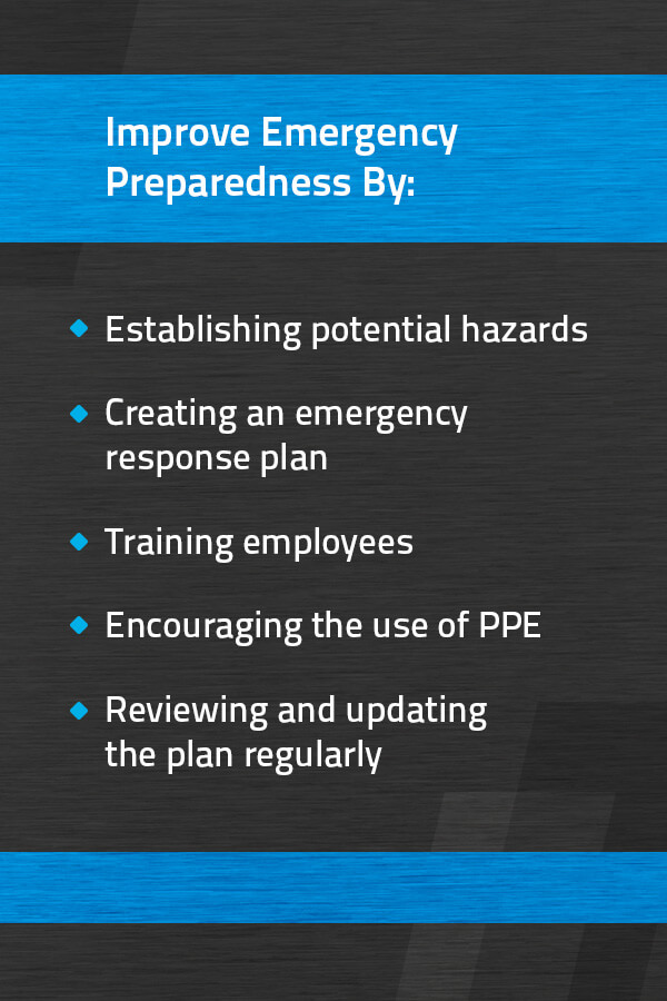 It’s important to put an emergency procedure in place to reduce injuries, accidents and fatalities in the workplace. This procedure should involve establishing exactly what constitutes an emergency and what workers should do in the event of an emergency. You can improve emergency preparedness by: