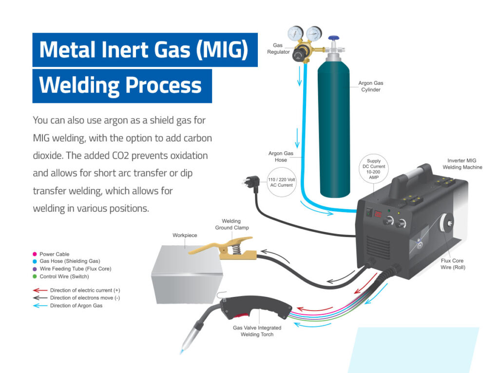 You can also use argon as a shield gas for MIG welding, with the option to add carbon dioxide. The added CO2 prevents oxidation and allows for short arc transfer or dip transfer welding, which allows for welding in various positions.